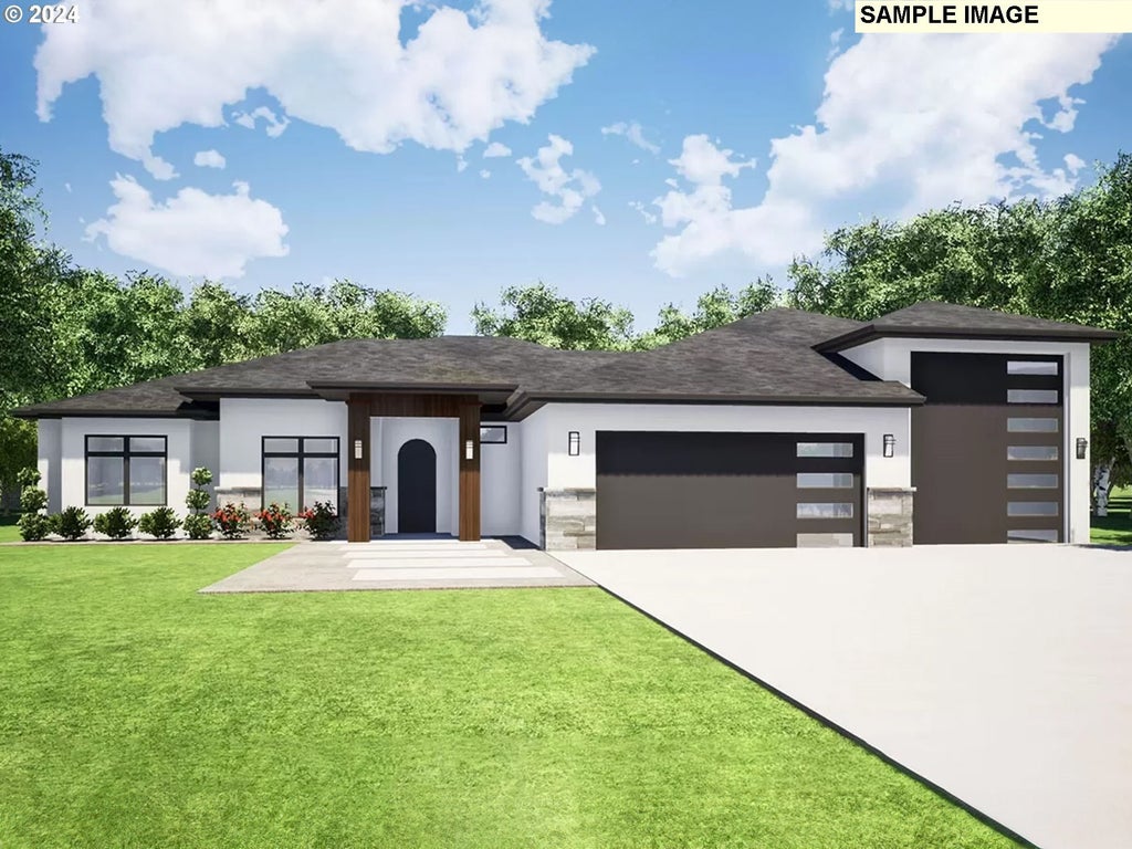 Custom contemporary ranch home plan boasts central, open living space that separates the primary bedroom suite from the secondary bedrooms for additional privacy. Large windows line the rear wall of the great room and dining area, offering views onto the rear patio. The island kitchen provides an easy flow, along with plenty of workspace and a walk-in pantry. The primary bedroom delivers a boxed-bay window as a sitting nook, access to the back patio, and a pass-thru closet that connects to the laundry room. Bedrooms 2 and 3 share a Jack-and-Jill bath along the left side of the home, and a home office near the entry includes a closet. The 3-car garage includes an oversized bay for RV or larger vehicles and a mudroom just inside creates the perfect drop zone after a long day. Great opportunity to build your dream home in prime Ridgefield location.
