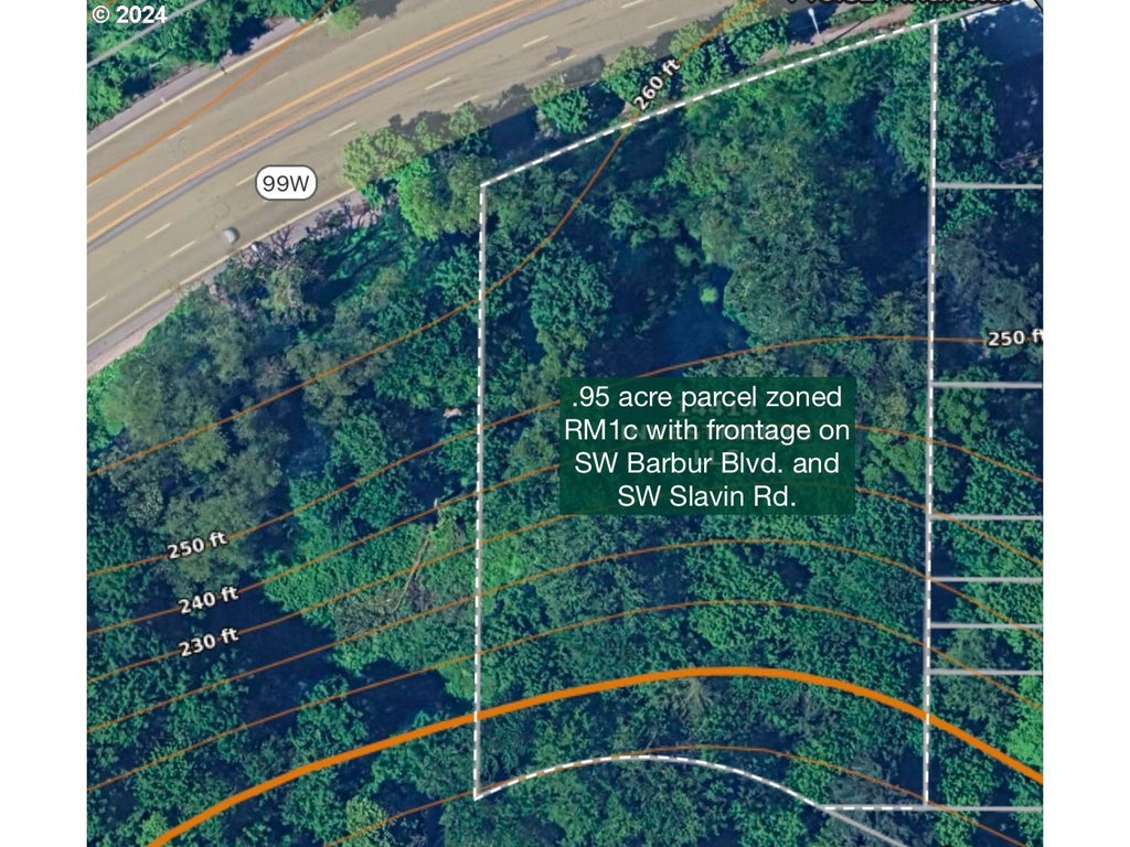 Large multifamily development parcel zoned RM1 in prominent close-in SW PDX location. Potential Willamette River and Mount Hood views once developed. Frontage on SW Barbur Blvd. and SW Slavin Rd. Northern (Barbur side) section of parcel is nearly flat / gently sloped.
