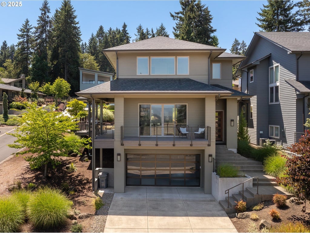 Modern Luxury with Expansive Eugene Views. Perched to capture sweeping views across Eugene, this newer, custom modern residence, featured on 2017 Tour of Homes, blends high-style living with effortless comfort. Designed with entertaining in mind, the home showcases high ceilings and a swanky open-concept layout that flows seamlessly from indoors to out. White oak hardwood floors run throughout, grounding the airy design with warmth and sophistication. At the heart of the home, the gourmet kitchen makes a statement with custom walnut cabinetry, high-end appliances, large island, walk-in pantry, sleek finishes, and generous workspace—perfect for daily living and lively gatherings.The oversized primary suite is a retreat of its own, featuring epic views, a stunning bathroom with a massive tiled roll-in shower and an expansive walk-in closet with custom built-ins.. Walls of glass invite natural light while connecting the interiors to the wraparound view deck, where outdoor dining, lounging, and panoramic sunsets await.A flat, usable yard and additional patio space extend the living experience, offering both style and function for entertaining, play, or relaxation. Every detail of this home is crafted for those who appreciate modern design, quality finishes, ease of livability, and unparalleled views.