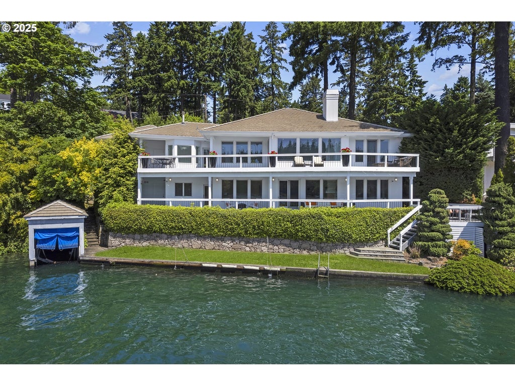 2 OPEN HOUSES: 10/25 SAT & 10/26 SUN 3:00pm-5:00pm. Unparalleled Oswego Lake Living. This custom waterfront retreat offers rare low-bank main lake frontage, stunning expansive dramatic views of Oswego Lake, and the ultimate in lakeside luxury. Designed to capture the beauty of its surroundings, the home features walls of windows that flood each space with natural light and unobstructed views of the water from nearly every room. Multi-level decks, a private boathouse, and dock provide seamless access to swimming, boating, and year-round recreation. Inside, the expansive great room’s view thru the full wall of windows is like walking on water, the room is accented with a tray ceiling, built-ins, and elegant fireplace. The gourmet kitchen is a chef’s dream, complete with a gas cooktop, Sub-Zero refrigerator, built-in wall oven, wine fridge, wet bar, and charming breakfast nook with glass-front cabinetry and amazing lake views. The formal dining area is enhanced by recessed lighting and is ideal for entertaining. The main-level primary suite is a tranquil escape, featuring a remodeled spa-inspired bath with dual sinks, a soaker tub, and a stunning walk-in shower. The lower level includes a spacious family room with fireplace, French doors to the deck, and three additional bedrooms—one of which is ideal for a lake-view office with built-ins. Additional highlights include an oversized utility room with washer, dryer, freestanding fridge, and ample storage space. Located just minutes from vibrant downtown Lake Oswego, this exceptional estate offers the rare blend of privacy, luxury, and access to one of Oregon’s most desirable lakefront communities.