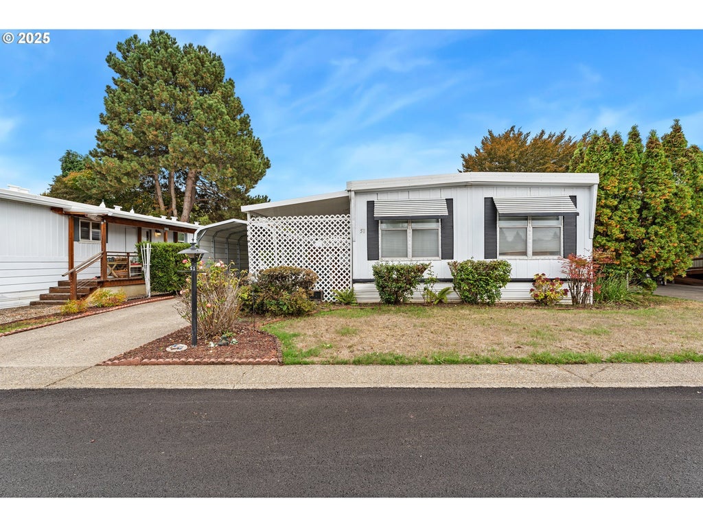 Welcome to this 2-bedroom, 1 bath double-wide manufactured home offering approximately 800 sq. ft. of comfortable living space. Step inside to find an open and spacious living room that flows seamlessly into the dining area, complete with a built in shelf and wall to-wall carpeting that adds warmth and comfort. Kitchen features recently updated countertops, a fresh white tile backsplash, and newly painted cabinets, creating a bright and inviting space to cook and gather. The bathroom was updated in 2019 with new cabinetry, tile flooring, paint, and a modern shower insert. Additional updates include a roof replacement in 2021, new carpet in 2018, a newly installed durable deck, and a brand-new awning providing extra shade and outdoor comfort. A newer carport with deep space offers convenient covered parking. The washer and dryer (purchased last year) are included for added value. This home also features a heat pump for efficient heating and cooling and sits on a spacious, low-maintenance lot. With its combination of comfort, thoughtful updates, and original charm, this home is move-in ready and ideal for those seeking an easy, relaxed lifestyle in a welcoming 55+ community. Schedule your tour TODAY!