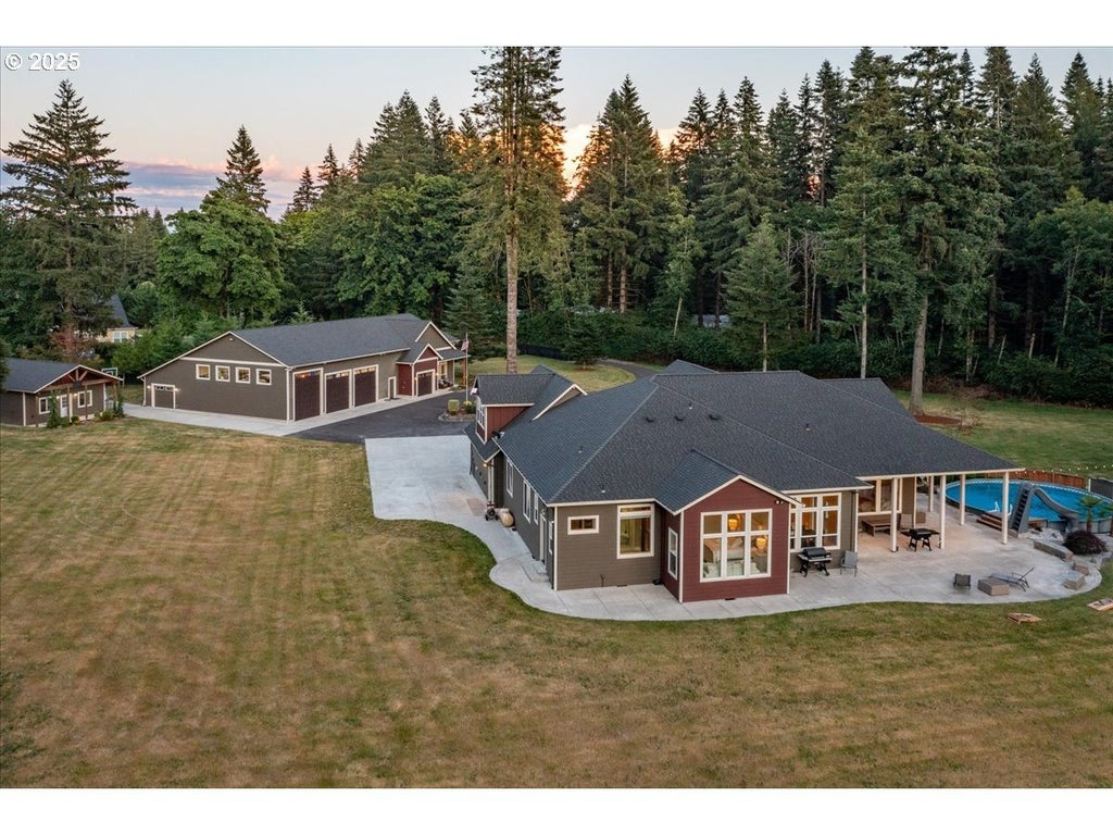 Custom & Timeless on Five Private Acres with the Best Mancave in all of Clark County! Modern, Great room layout with 12' ceilings everywhere. Entertainer's Dream Kitchen showcasing huge Island "Socializing" bar + sleek Dining Room. Two Primary suites on opposite ends of the house, plus Two Additional Bedrooms + Office and a Den! Loft Upstairs is a hip Theater room with all the gear and a built-in bed too. Expansive Patio & Pool with a Sleek Slide and a firepit space situated on a private parklike setting. Upgraded Geothermal heat + AC. The shop has a full-on one-level Apartment, with its own garage and entrance. Same Great room style as the house with 12' ceilings, its own laundry and a spiral staircase leading to the loft. Shop is fun! There's a lofted fantasy Gameroom, 3 big screens connected to sound system and a cool hangout room. Just imagine the parties at your place! Everything top-of-the line construction. So much pavement! Total Dwelling Sq Ft = 10,498. A Masculine, Self-contained property for an incredible lifestyle. About five minutes to the High School and 30 minutes to PDX but not another home in sight.
