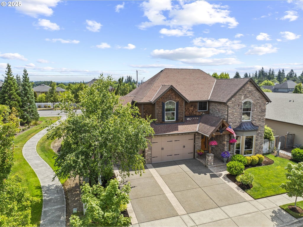 From the moment you drive up, you'll find this gorgeous, quality built, unique home w/unexpected charm & special details that is like no other in the neighborhood. Luxurious & rich w/soaring ceilings, beautiful fixtures, 2 fireplaces, stone walls, wood floors, iron railing, arched details & grand wood beams! Open concept yet large, defined spaces. Designer kitchen w/honed granite, butler's pantry, walk-in pantry, stone workstation & hood surround, farm sink, double ovens & pot filler. Spacious primary w/vaults, free-standing stove, private balcony, custom closet, walk-in shower, soaking tub w/Mt St Helens view! Deluxe oversized garage, stunning landscaping w/concrete walkways, in-ground hot tub/spa, outdoor kitchen, grill & 3rd fireplace!