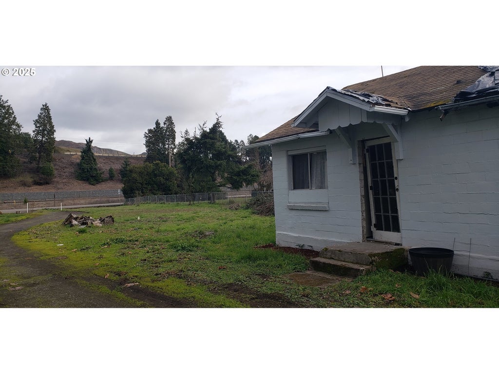 Commercial/Residential 1.04 Acre, 550 sq ft block house, 2 septic's, 2 20'x 40' concrete slabs, city water, Corner lot, price reflex condition. bring hammer and nails. used for storage. new upgraded power box on pole for easy connect Bring your 5th wheel while you restore or build new. Flat easy in and out, backs up to Umpqua River (200 ft frontage) with deeded water rights. great possibilities here
