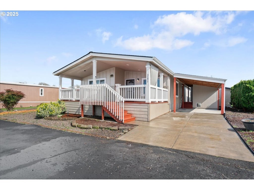 Welcome to Lakeside Village, an all-ages community in South Salem! Friendly front porch welcomes you into this gently lived in home offering Great Room living, vaulted ceilings and an abundance of windows for a beautifully well-lit home year-round! This home has a generous and well laid out kitchen featuring an island and ample storage, a Primary bedroom with walk-in closet and private en-suite bath. And you'll appreciate the efficient Heat Pump for year-round economical heating and cooling!